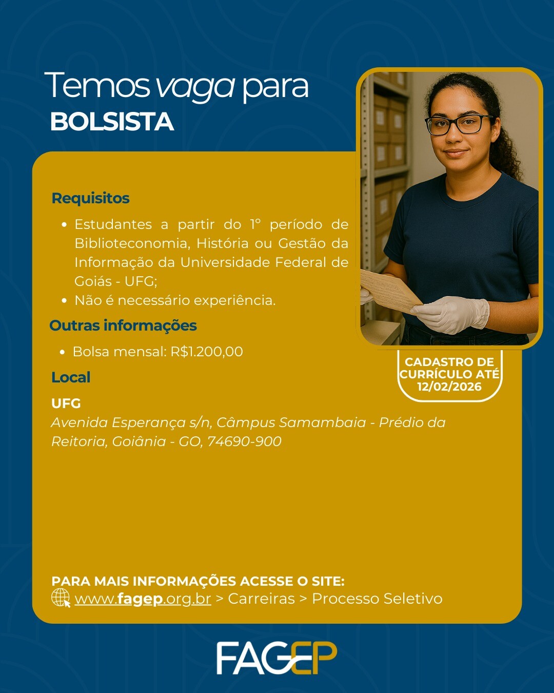 O Projeto da Faculdade de Administração, Ciências Contábeis e Ciências Econômicas (FACE) da Universidade Federal de Goiás (UFG) está com vaga aberta para bolsista. A oportunidade é destinada a estudantes a partir do 1º período dos cursos de Biblioteconomia, História ou Gestão da Informação da UFG.